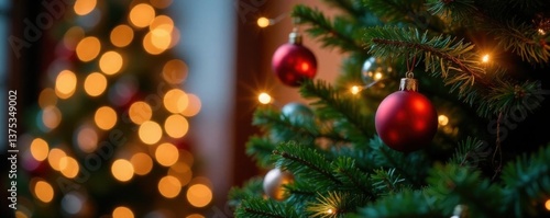 Blurred spotlight on a decorated Christmas tree with shining lights and colorful ornaments, Glow, Festive, Ornaments