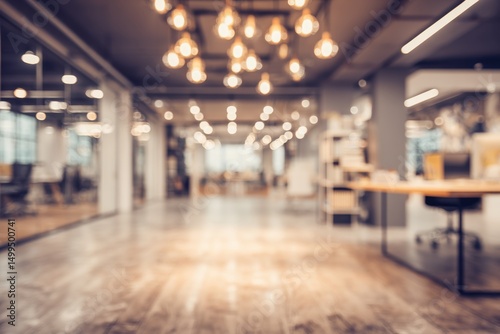 Blurred View of Modern Office Interior with Hanging Lights and Desk Space in Warm Tones