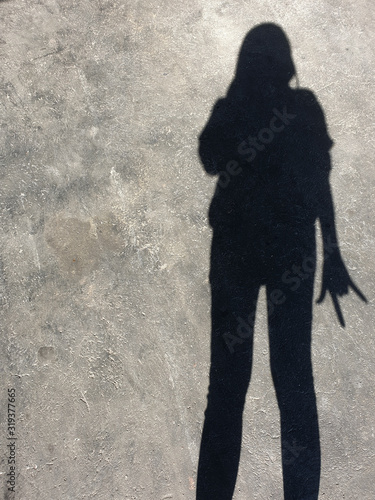 Blurry shadaw and silhouette of a women stand on the road.Light and shadow women.The sun is casting over the wall.pointing finger.Hand symbol.black and white background