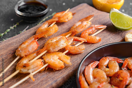 Board with tasty shrimps on table, closeup