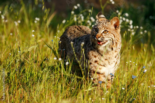 Bobcat standing in a grass with flowers