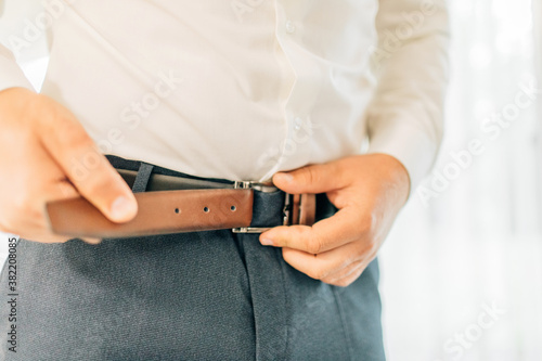 Body detail of well-dressed man, close-up. Leather belt in vintage fashion. Men sing belt on his pants due to stomach.