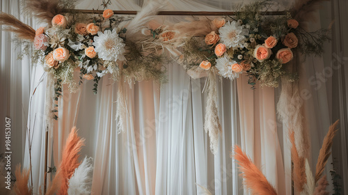 Bohemian Wedding Backdrop: A romantic and ethereal wedding backdrop featuring delicate flowers and pampas grass, creating a dreamy and rustic ambiance for a special occasion.