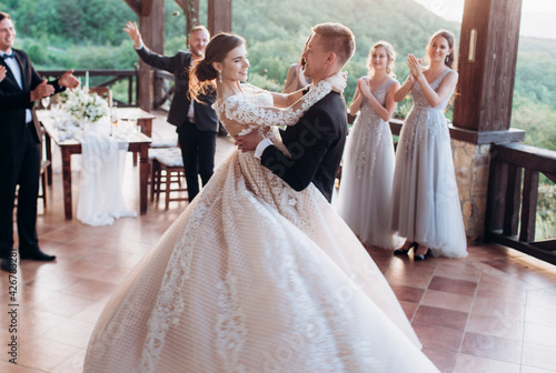Boho style wedding party. Banquet with friends, bride and groom.