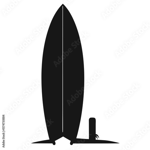 Bold black silhouette of a single surfboard standing upright perfect for summer and beach themes
