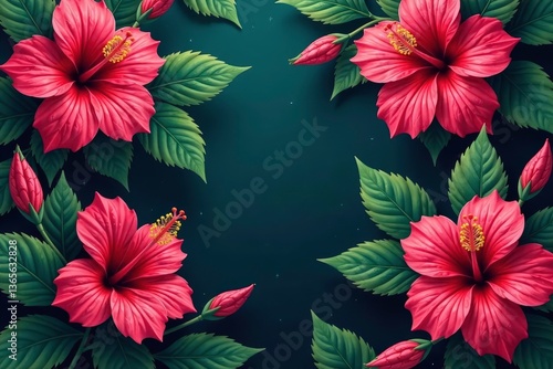 Bold hibiscus flowers, lush leaves, stylized repeat , illustration, artwork, pattern