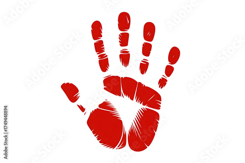 Bold red handprint against a white background, conveying a sense of urgency and impactful statement.