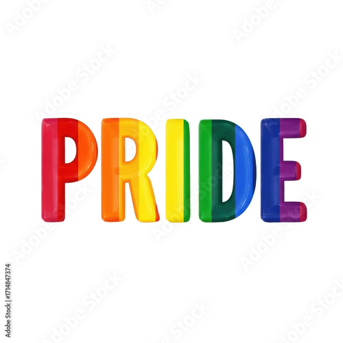 Bold, uppercase 'pride' word, textured handwritten, each letter with vertical rainbow colors, on a transparent background, concept of LGBTQ+ celebration and diversity
