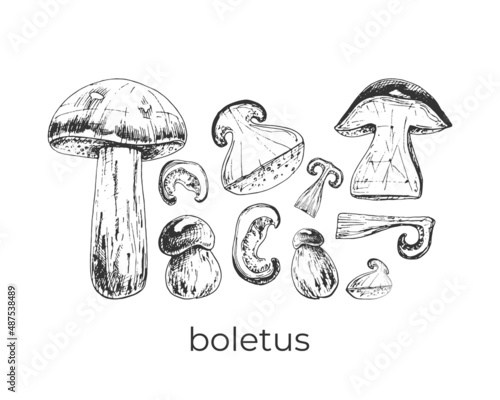 boletus, mushrooms of the genus Leccinum, edible, drawing, sketch, set, dry, freshм
