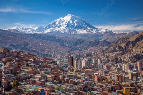 Bolivia La Paz. Aerial View of La Paz City Landscape with Illimani Mountain in Background