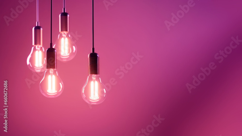 Bombillas colgadas del techo encendidas con pared rosada de fondo con espacio para texto.