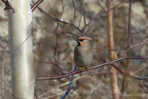 Bombycilla garrulus. Bohemian Waxwing spring sits on the branches of birch trees in the Yamal Peninsula