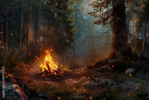 Bonfire burning brightly in a dark and mysterious forest, with sparks flying up into the air