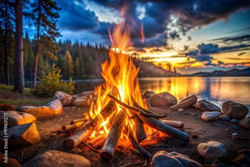 Bonfire by the Lake, warm, glowing campfire on a scenic lakeshore at sunset, surrounded by rocks and forest - perfect for themes of nature, camping, warmth, and serenity