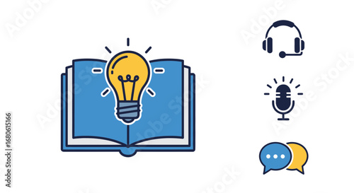 Book with lightbulb, microphone, headset and speech bubbles icons for education and communication.