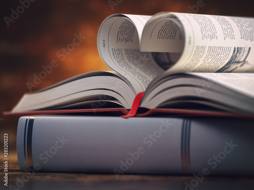 Book with opened pages in form of heart with space for text. Reading, religion and love concept.