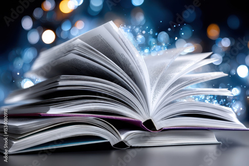 Books display knowledge and imagination with swirling bokeh lights in the background