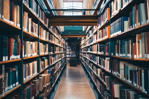 Bookshelves filled with books in a library or bookstore aisle perspective view.
