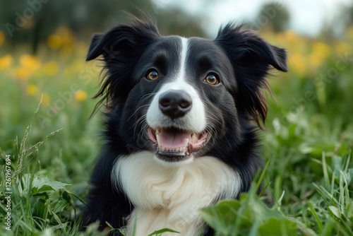 Border collie dog lying in grass and smiling