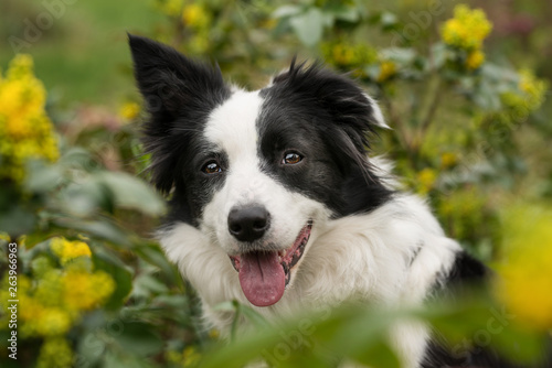 Border collie dog with mahonia branches