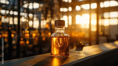 Bottle of amber liquid with warm backlight in a production environment