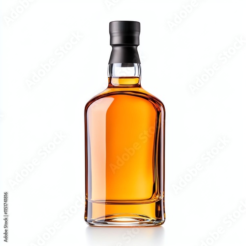 Bottle of amber spirit with black cap, white background. Perfect for beverage, alcohol, or product advertising themes.