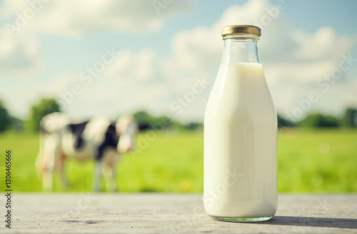bottle of fresh milk, yogurt or kefir on a table in a field and a cow grazing on a green meadow
