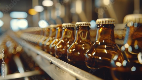 Bottled beer on conveyor belt in brewery. Close-up industrial photography.