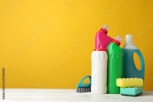Bottles with detergent and cleaning supplies on yellow background, space for text