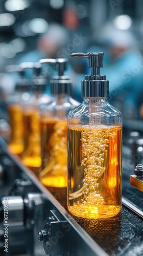 Bottling process of liquid soap in a modern manufacturing facility during daytime