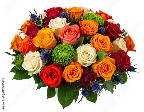 Bouquet of flowers rose mixed color orange green red pink white yellow white blue isolated on transparent background.