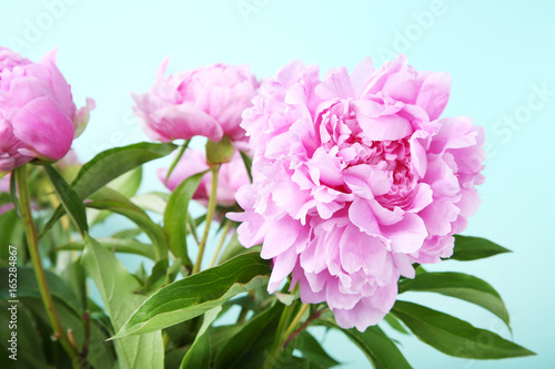 Bouquet of peony flowers on mint background