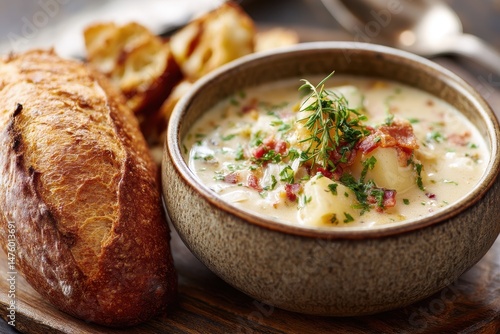 Bowl of clam chowder accompanied by crusty bread