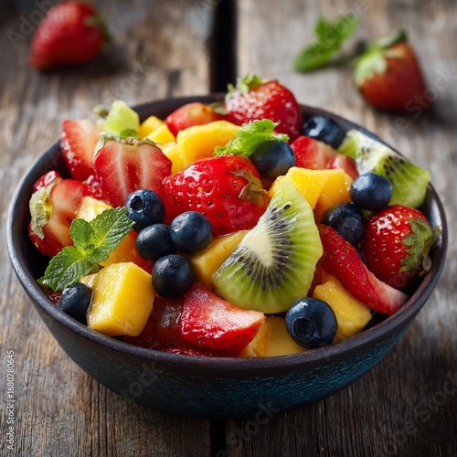 Bowl of colorful fresh fruit salad with strawberries, blueberries, kiwi, mango, and mint leaves, served on rustic wooden table, healthy summer dessert.