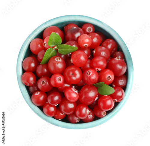 Bowl of fresh ripe cranberries with leaves isolated on white, top view