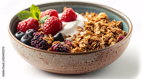 Bowl of granola with yogurt and fresh berries on a white background