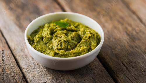Bowl of green curry paste on a wooden background. Food and spice concept.