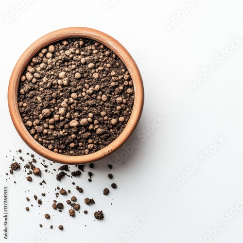 Bowl of ground potatoes with soil scattered on a white background, capturing the raw essence of culinary preparation
