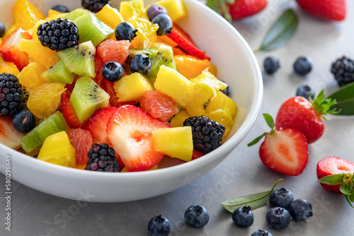 Bowl of healthy fresh summer mixed fruit salad close-up. Plate delicious and wholesome food with copy space