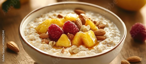 Bowl of oatmeal with fresh fruit, nuts, and honey drizzle, rustic kitchen