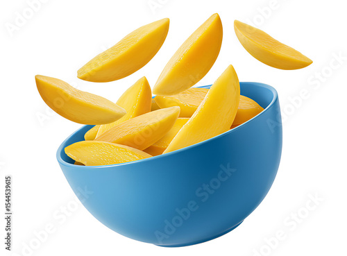 Bowl of ripe mango slices with falling fruit PNG for tropical dessert visuals and plant-based diet designs. Mango fruit pieces dropping into bowl PNG. Isolated PNG of mango chunks