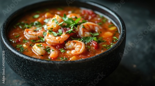 Bowl of shrimp soup with vegetables and herbs on a dark surface.