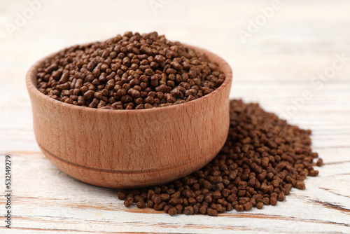 Bowl with buckwheat tea granules on white wooden table, closeup
