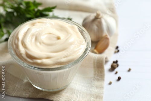 Bowl with mayonnaise and ingredients for cooking on wooden background