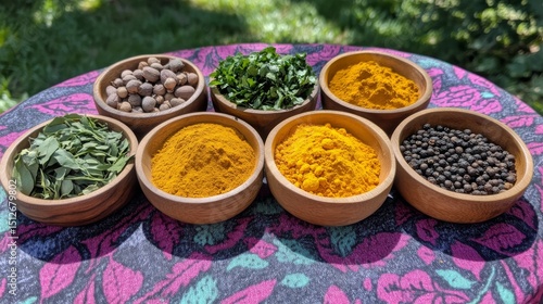 Bowls and scoops containing an assortment of colorful spices are positioned on a surface made of dark wood