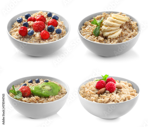 Bowls of oatmeal with berries and fruits on white background