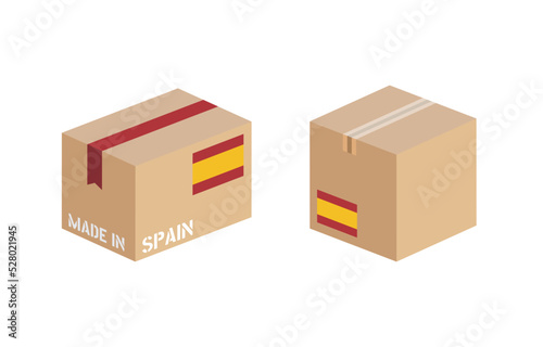 box with Spain flag icon set, cardboard delivery package made in Spain