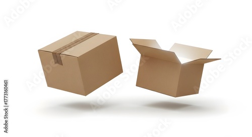 Boxes in the Air: Two cardboard boxes, one sealed, the other open, levitate against an unseen backdrop. Perfect for representing logistics, shipping, or the art of delivery.