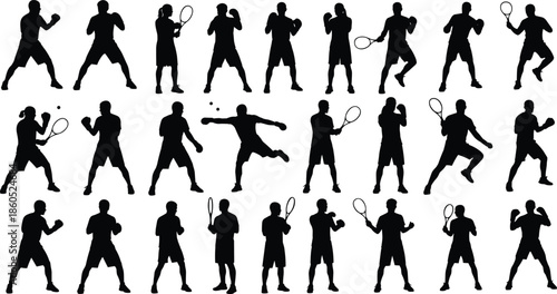 Boxing and tennis silhouette collection, athletic poses, dynamic sports movement, black vector figures, action stances, racket swing, punch motion, fitness, isolated design