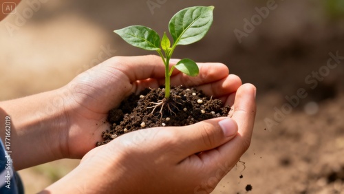 Boy cradling green sprout with soil in hands outdoors